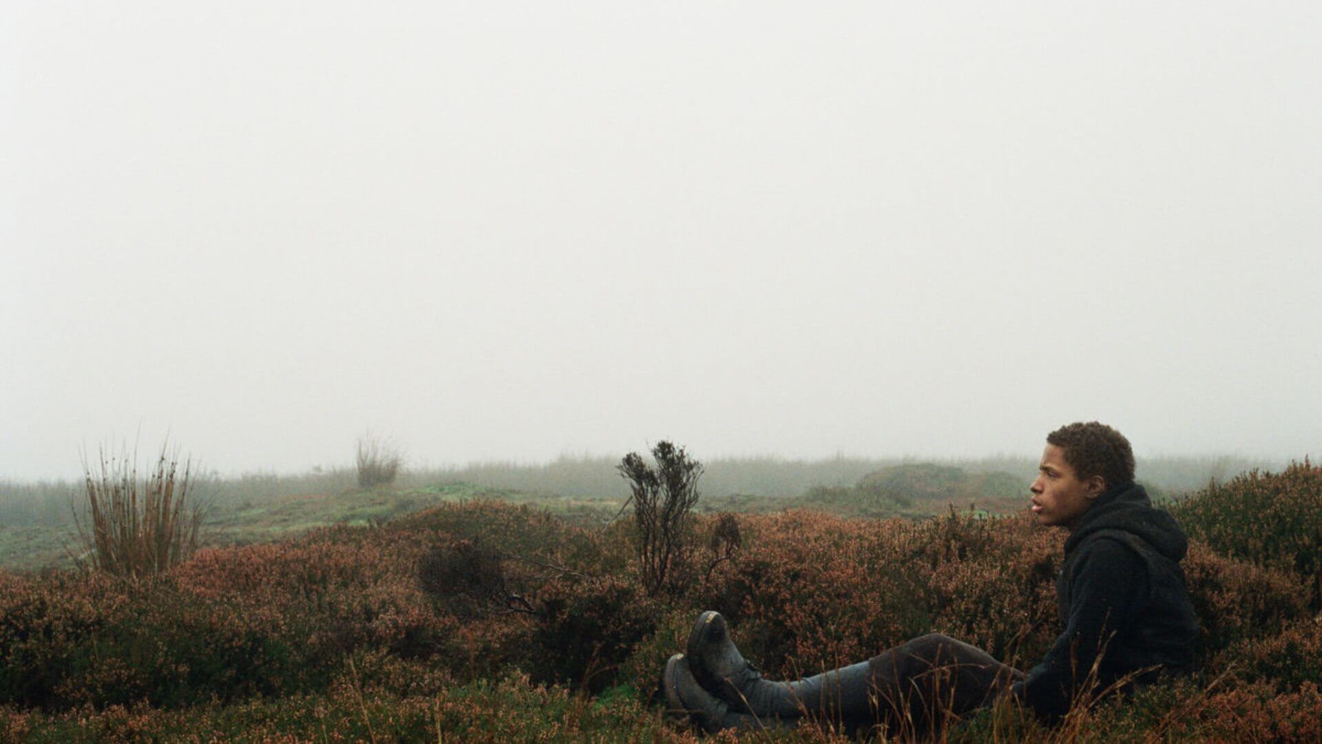 Two children, one a pale freckled girl and the other a boy with light brown skin, walk through a sodden moor, the mist on the ground so thick that the grass disappears only a few steps ahead of them. As the girl skips, the image shakes, then goes in and out of focus as the boy watchfully follows. She stops to playfully feed him a piece of bread, saying “Open yer mouf” with an unmistakable Northern English twang. Neither actor is obviously professional, though each has an air of authenticity. There’s no music; there’ll be none until the end credits. The only soundtrack of this take on Wuthering Heights is instead the perpetually whistling winds, the stray cry of a bird, and the rattle of a shivering tree branch tapping on a window.