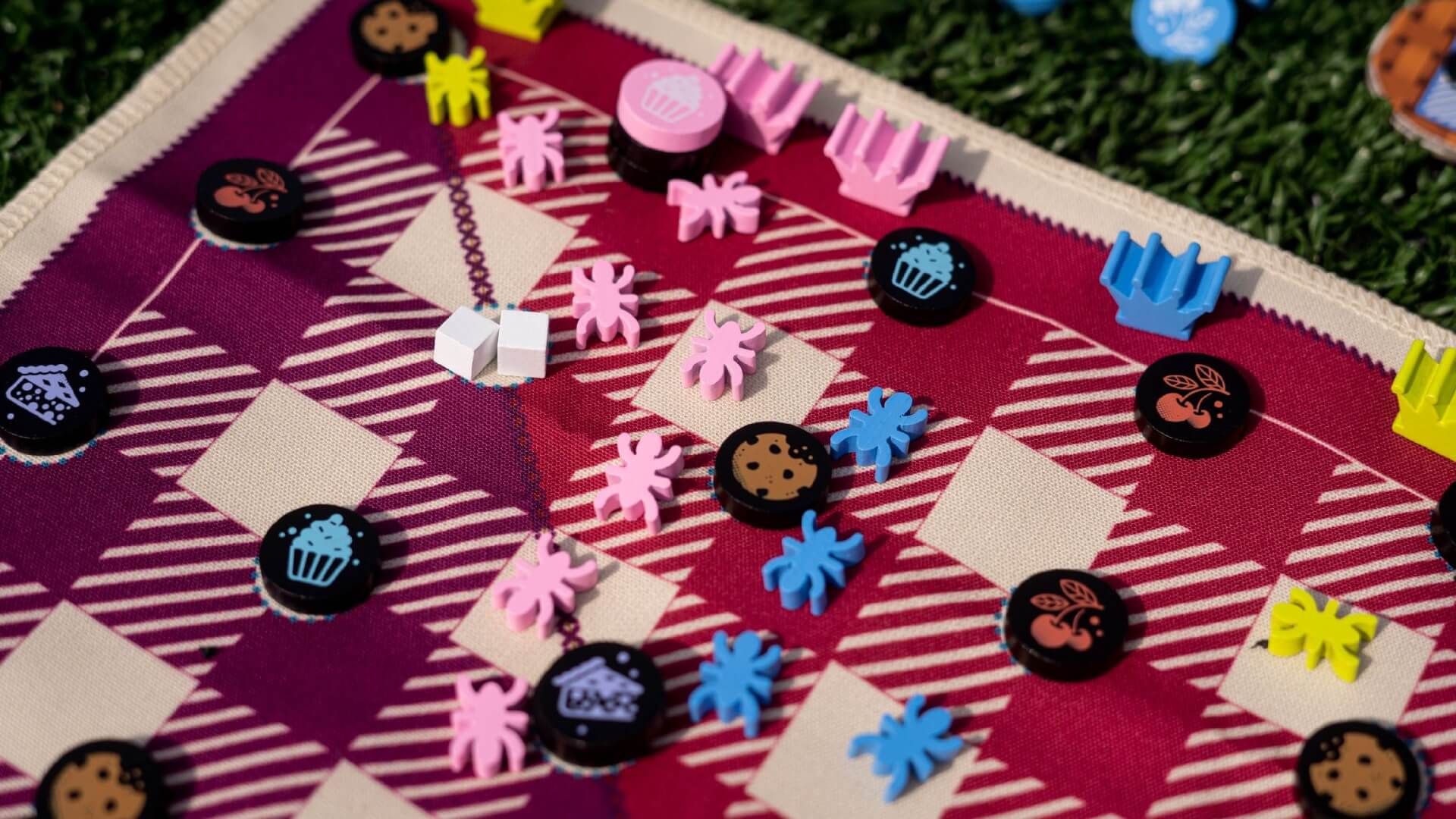 In Gingham, you are the ants, and their queens, trying to create chains on the picnic blanket to connect and claim tokens for various types of sweets located at the vertices of the chess-like board. It starts slowly, but space on the blanket becomes tighter as the game progresses, leading to longer chains and bigger stacks of sweets for higher point gains in the last few rounds.