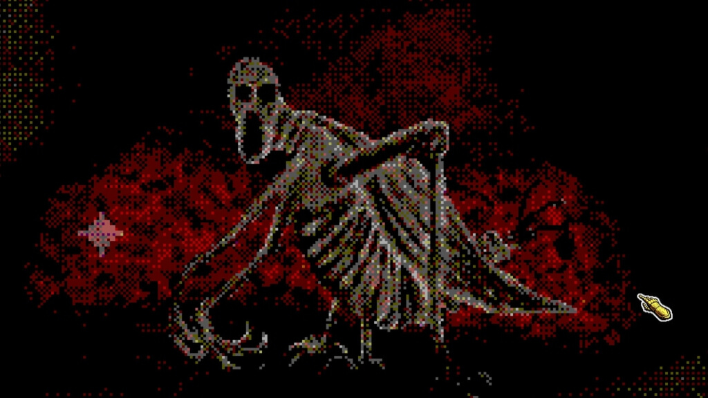 Horripilant lands at an awkward point between the various extremes it charts. It would be disingenuous to say that the game’s ugly-beautiful adventure game side and its basic, brutish idle gameplay don’t touch at all. Deeper progress into the dungeon allows the player to secure new items necessary for their puzzle solving, and—very rarely—an aspect of that exploration gameplay will reflect in some way in the combat. (Which is otherwise one of the more simplistic idle games I’ve powered through in recent memory; a good idle game makes decision-making thrilling, but Horripilant’s is a depressingly straightforward numbers grind alleviated only by the fact that the game itself isn’t very long.) The real issue is that the two sides of the gameplay make little effort to actually synergize. Instead, you have two fundamentally separate games that sometimes require waiting on the other in order to complete—whether that means the straightforward grind of killing monsters, smacking trees, and occasionally hitting a reset to get some form of prestige currency (spent on a largely lackluster spread of abilities), or the more esoteric need to recharge your brain before tackling another fairly fiendish riddle. Those few times they do rub up against each other are a delight, but if you hold to the idea that a “game” is the thing you spend most of your time actually doing while playing it, “Horripilant the game” is often disconnected from those things “Horripilant the loose collection of puzzles and creepy ideas” does best.