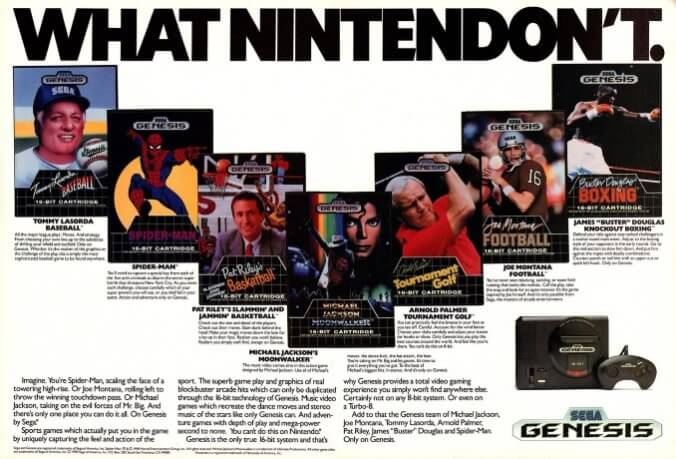 Katz took a tangible, but ultimately short-sighted approach. He gambled on a number of expensive brand deals and celebrity endorsements that he wagered would translate to brand identity. This included pop icon Michael Jackson (Moonwalker), golf superstar Arnold Palmer (Arnold Palmer Tournament Golf), Joe Montana (Joe Montana Football), and several other athletes who weren’t Mario or a Saturday morning cartoon character. While this early gambit towards the sports gaming demographic did have some long-term gains, as the console would later gain a strong reputation for the genre, it wasn’t enough when faced with Nintendo at the toy stores during the 1989 holiday season.