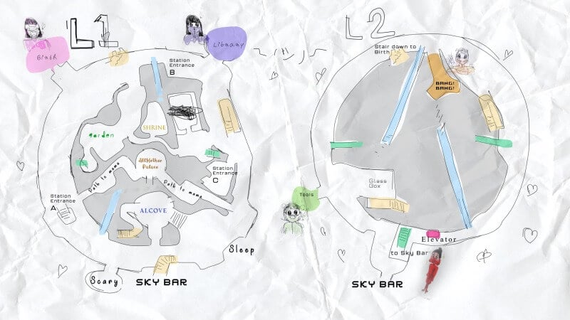 This same logic extends to the rest of the map, which labels locations by the purpose they serve the sisters. This method of labeling makes the location only identified by the descriptor “scary” all the more interesting. It is a gravesite of sorts, and its context only becomes clear through the natural progression of the story. Even without this knowledge, though, it still bears an understandable eeriness that many of the sisters would see as scary. The further the player and Watcher progress, the more it becomes clear that this map does not depict the entirety of what the Orchard hides.