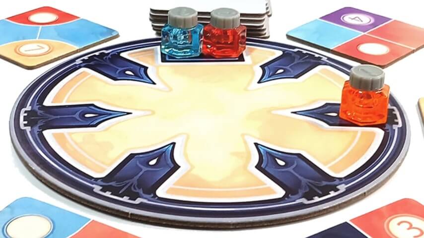 In Ink, the tiles are all square-ish, with four squares* on them in two to four colors, with five total colors in the game. Some squares have white circles on them; some of those white circles show a number from three to seven. Each player starts with one of those tiles, with four different colors. There’s a rondel that goes in the middle of the table, with six more tiles randomly drawn from the bag placed around it, and a seventh space with an X on it in between two of those tiles. Each player starts the game with 24 ink bottles, 12 for their two focus colors and 12 for any color. Players begin with their tokens on the X, and then may move as many spaces as they want around the rondel, taking the tile where their token lands.