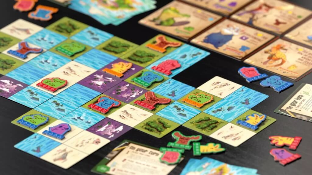 You’ll then place one of your animal tokens on the card you just placed. You start the game with one token for each animal type, plus one or two flora tokens, depending on the player count; thus you get only one chance to score each animal during the game. Every animal type comes with two scoring methods, one on each side of the card, so you can customize the game each time you play, although the flora tokens only score if you use the B side—if you use the A side, it’s just a throwaway turn when you place them. Most of these tokens score based on what is adjacent to, near, or in a line with the token itself, which means that almost nothing is certain in Oddland.
