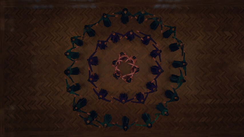 That includes a big shift in color scheme, as the series focuses, not on red-clad Handmaidens, but purple-wearing “plums”—i.e., young girls who are, or are about to be, at a point that the always-charming regime of Gilead considers to be “marriageable age.” (The school setting that we see the characters at is presumably one of the “wife schools” mentioned in the later seasons of the original show.)