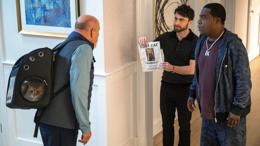 Former indie-film darling Arthur, however, is both the “sensible” one of this unlikely duo and the audience surrogate witnessing Reggie’s eccentric schemes. (Daniel Radcliffe has a great, Kermit-esque to-camera look.) When Reggie spots a lost-cat poster he’s convinced is Namath, the beloved emotional support animal of his spiraling former head coach, Duck Donovan (Corbin Bernsen), we’re prepared for him to swing into ill-considered action. When Arthur ultimately joins in, the comic balance is off.
