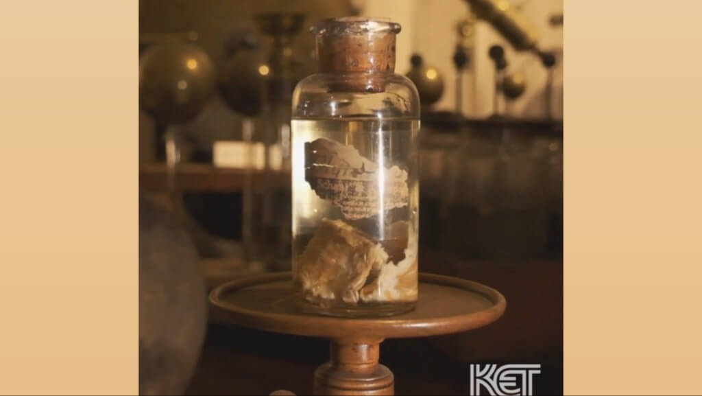Thing we were happiest to learn: Much like Arby’s, we’ve got the meat. Not only were samples recovered and studied at the time, they were preserved. The Bath County History Museum has the last surviving chunk, as part of its Kentucky Meat Shower exhibit. (A 2025 festival for the 148th anniversary attracted 500 visitors and held a “mystery-meat chili cook off.”) Their sample was lost and then rediscovered in 2004 in storage at…wait for it…Transylvania University. While it seems like blood falling from the sky would be a natural subject of interest for Dracula’s alma mater, Transylvania U is actually a private liberal arts college in Lexington, so named because “Transylvania” (meaning across the woods) was the colonial name for heavily forested southwest Kentucky pre-statehood.