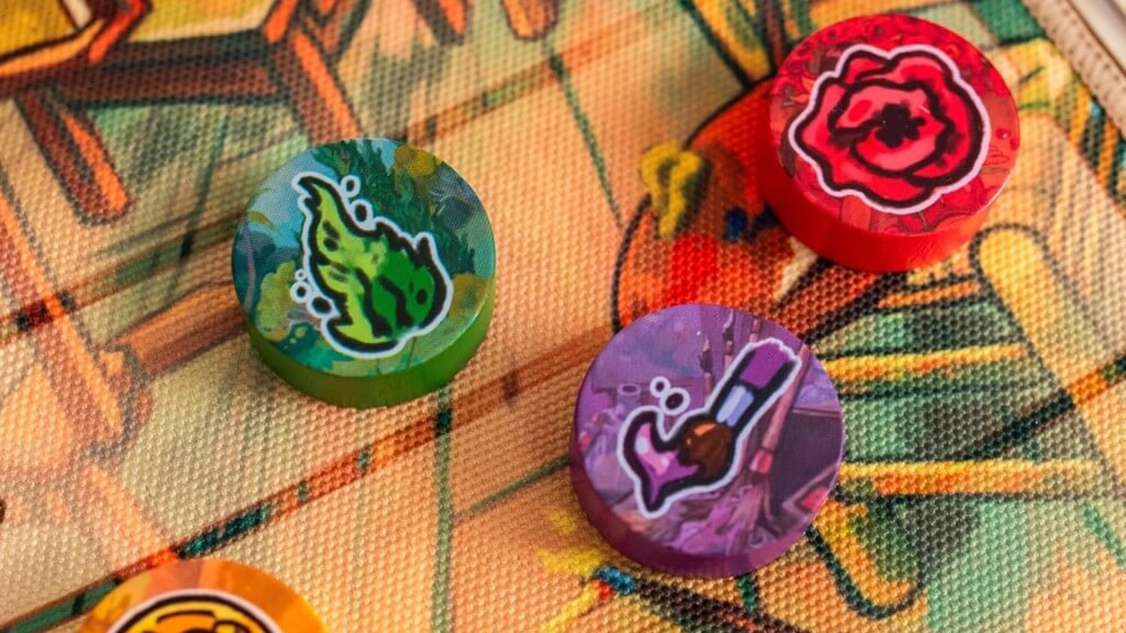 The deck in The Yellow House comprises cards in four suits, each of which is supposed to represent one of the four elements required to create good art: skill, inspiration, passion, and money. The cards have no value; there are seven of each color, all equivalent. There are five wild support cards that you set aside at the start of each round, available to either player. Then there’s a cloth board in the middle showing rows with the numbers one through eight on them; at the beginning of each round, you put the four tokens matching the four suit colors into the first row, then deal 12 cards to each player.