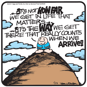 That’s a pretty stark description, but also an accurate one. Bad things happen to Ziggy on a daily basis, and yet there he is again the next day. Created by Tom Wilson, who died this past September, and currently written and drawn by his son, Tom Wilson Jr., Ziggy lives in a landscape as harsh as anything Samuel Beckett ever created, befuddled at all times by problems great and small. He’s a little guy in a big, mean world that he lets get to him but never crush him. He even pauses from his string of defeats to deliver the occasional affirmation about how life is should be appreciated (despite all the evidence to the contrary in previous strips).